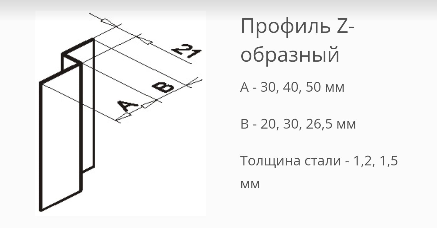Размеры полок 30 (40, 50)*20 (30, 26.5) мм, толщина металла от 0.9 до 2.0 мм, длина изделия 3 метра, 1, 2 класс защиты цинка. Если Вы не нашли то, что искали, напишите нам, у нас наверняка это есть.